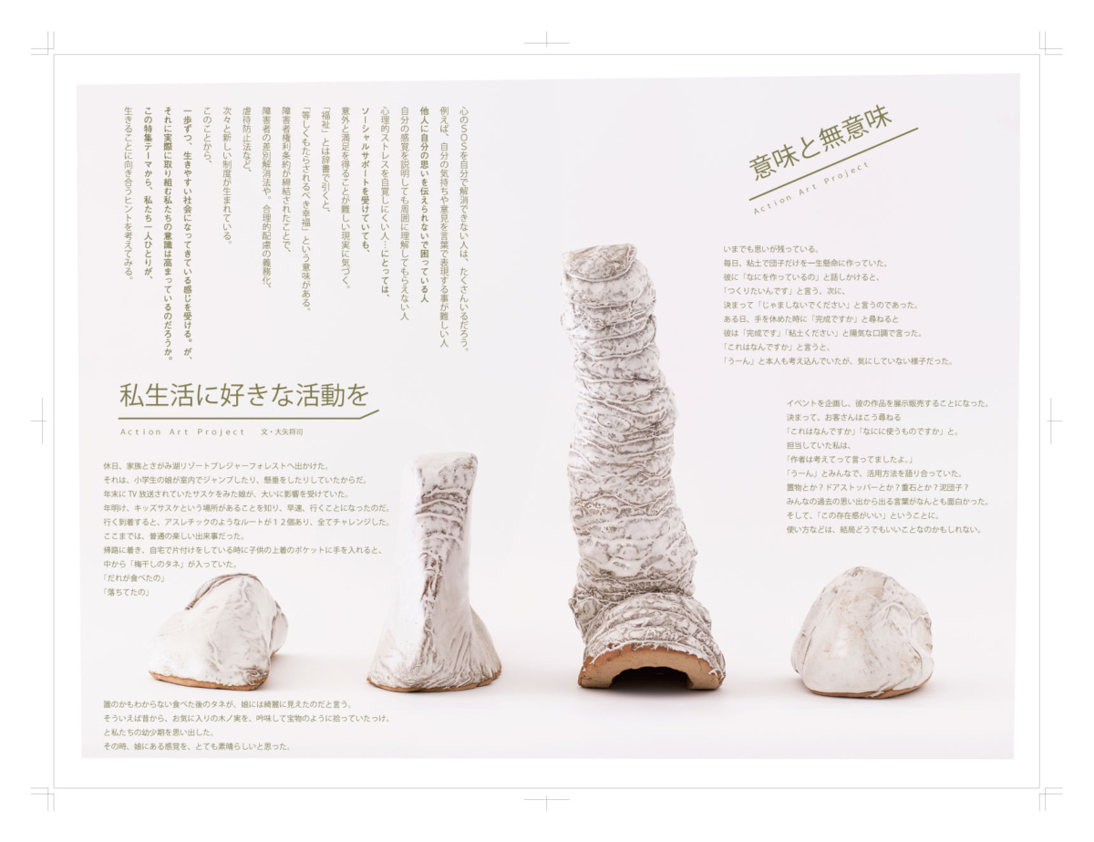 工房YUAIで創作している方々と交流をしました。エネルギーの塊のような作品群を見て頂きました。作品とファッションの融合をテーマに、コダンさんのインスピレーションが形になったのが今号の目玉です。ファッションのように作品を身に纏い、モデルやメイクなどが集い美しい写真が生まれました。また、撮影ではフォトグラファーである田中舞さんの感性が輝いています。