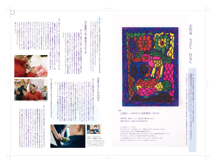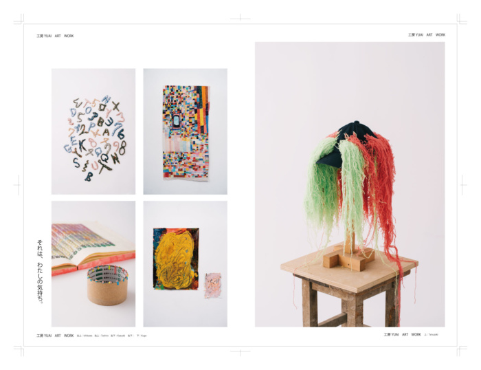 工房YUAIの創作活動 に お い て 支 援 員 と利用者は密に関 わ っ て お り 、 支 援 員の提案 や ア イ デ アは創作物の色彩や 形状 に 大 き く影響 す る 。 支 援 員は利用者 ひ と り ひ と りの特性や特徴 に 合 わ せ て 素 材 、描画 材 、 モ チ ー フ 、 道 具 、 治 具 を 用 意 し提供 す る 。利用者 が そ れ に興味 が あれば提案 に乗っ て く る し 、興味が無 け れ ば そ れ で 終 わ り で あ る 。 そ う し て出来上 が る創作物 は 、 「 支 援 員の意思 1 」 + 「利用者の意思 1」=「2 」 という物なの だ ろ う か 。 も し 「 1+1 = 」 という公式 だとす る と 、 同 じ 環 境 を提供 すれば違う 支援員 だ っ た と し て も毎回 答 え は 「 2 」 に な る だ ろ う 。 し か し 彼 らは支 援 員 そ れ ぞ れ と 違 った関係を 築いている 。人と人な ので当 た り 前 の こ と だ が 、気が合う 人もいれば合わない人もいる。敬っている人もいれば悔っている人もいる。つまり、たとえ同じ環境が揃ってい たと し て も 、 支 援 員 との関係 に よ って生ま れ て く る表現は 違 っ て く る 。 そ う 考 え る と 、 イメー ジ と し て は 「青+ 黄= 緑 」の方が近い か も しれな い 。一見1+ 1 と大差な い よ う に 見 え る か も しれない が 、そこ に は 大 きな違い が あ る と私は思っ ている 。 日常生活 に お い て 、 私 た ちは時 に や り た く な い こ と に も 取 り組ま な く てはい け な い こ と が あ る 。 そ の 時 ど う 向 き 合う か に よ っ て 、 自 分 に 還 元 さ れ る経験値や体 験 、 何 よ り結果が 変わっ て く る 。 ど う せ 同 じ 時 間 を 過 ご す な ら 、 何事 に も 全 力 で取り組みた い も の だ 。 し か し 、何か に 全 力 で取り 組 む こ とは意外と 難 し い 。興味 や モチベ ー シ ョ ン は人それ ぞ れ 、 そ の時その瞬 間 で違う か ら だ 。 大 竹 さ んはど ん な 時 も全力 だ 。 食 事 も 、 散 歩 も 、 挨 拶 も 、 歌 も 、 野 球 も 、 創 作 も 。創作支援 に お い て 、私の魂が ザラザ ラ (良い意 味 ) す る瞬間 は 、 全 く 予想と 違 った展開 に 遭 遇 した時 だ 。 意 思 と意思が す れ 違 っ た こ と で 生 ま れ る表現 は 、 き っ とお互いの 驚 き と 興 奮 を はらん でいる 。 大 竹 さ んはい つ も 全 力 で す れ 違 っ て く る 。全力だ か ら こ そ相手が 誰 で も ど ん な 物 で も 、そこ には人の心を動か す何かが生まれる 。 そ し て その一つ一つは必ず 違 っ た 表 現 となっ て 現 れ て く る 。 この関係は掛 け 算 で も割り 算 で も な く 、 や っぱり 足 し算なの だ ろ う 。 そ し て それは一対一 だ っ た と し て も 、 そ の 和は 2では な く緑や紫や橙なの だ 。