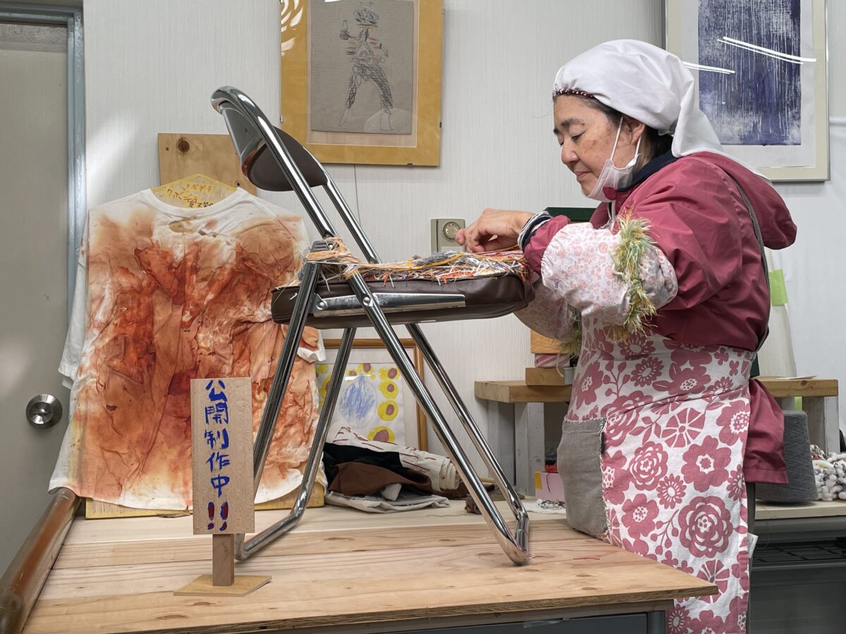 創作活動の中で、刺繍や織り、オブジェつくりなど表現は多岐に渡します。1人ひとりが取り組む表現活動はみんなバラバラです。みんなが同じことをしていないことが、なんかいいなーと思います。ひとりの表現を追っていくと、興味が見え楽しい気持ちになります。藤枝さんから、工場用の残糸などを提供して頂いています。活動では、ものすごく消費する糸をこのような関りで活用できるのはとても嬉しい限りです。会場では、藤枝さんの活動を共有しながら、素材をテーマにして語り合いたいと思います。同時に、作品展示している作品を支援員が解説しながら、アーティストの「良いところ!!」をたくさん見つけて行ければと思います。